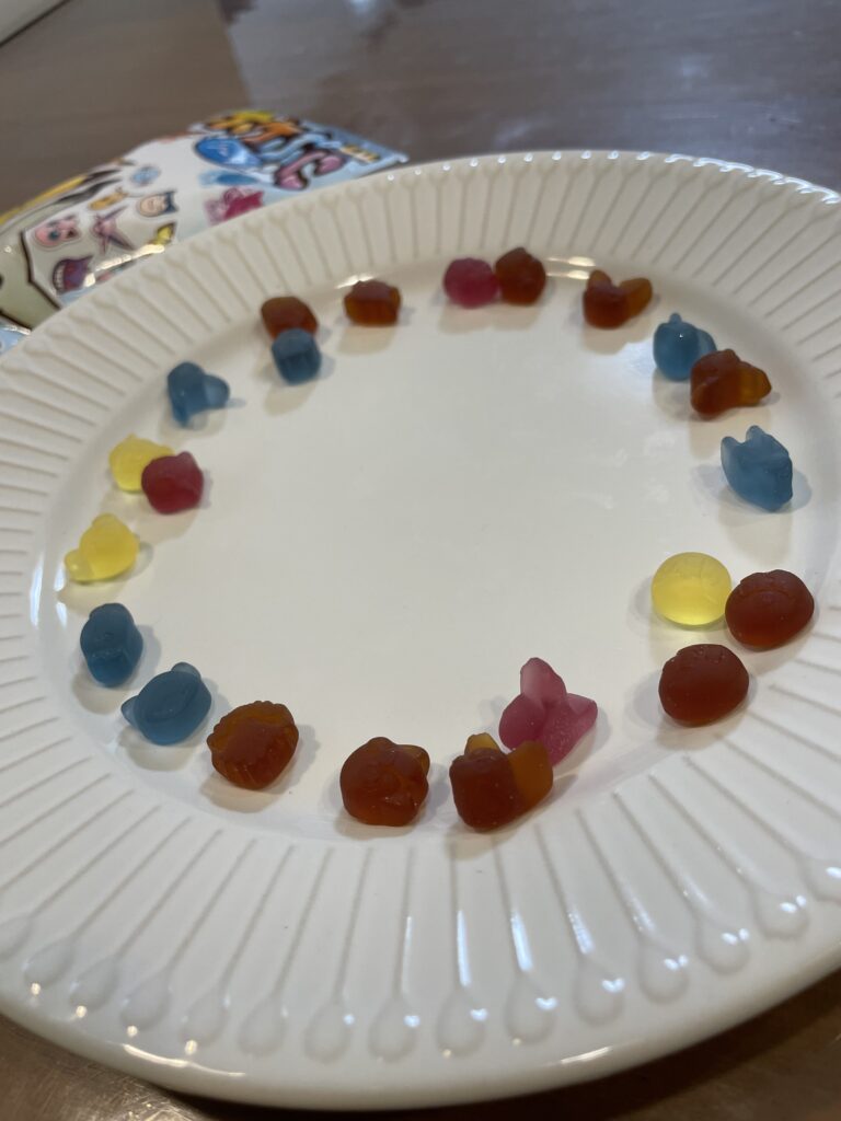 - グミをお皿に出したら、まずはポケモンのキャラクターごとに分けます。