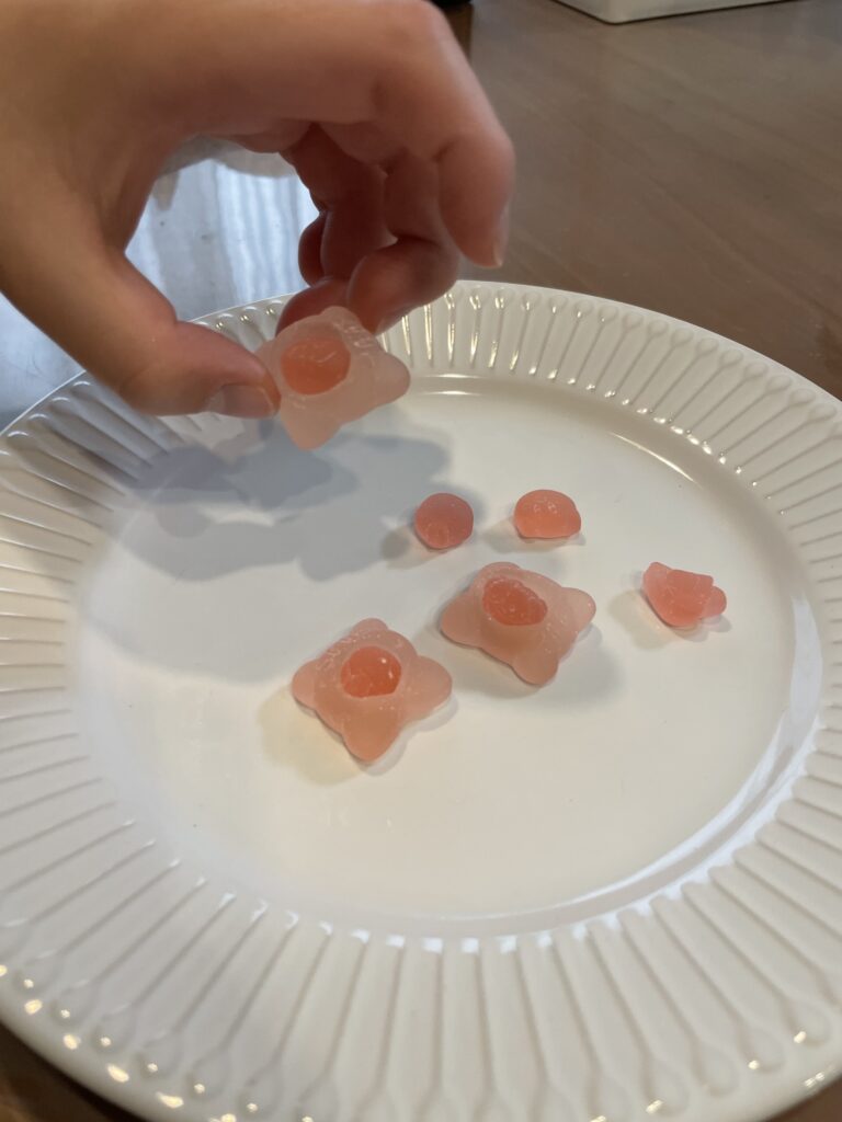- グミとグミを組み合わせたら、眺めた後口に入れます。味わいます。