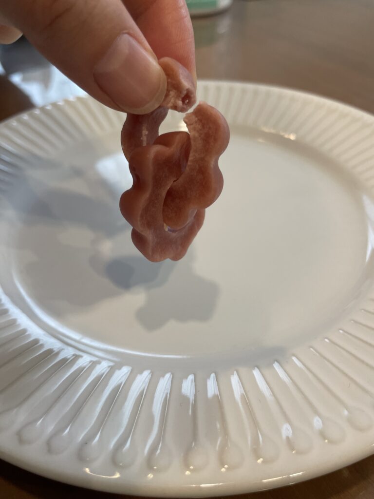 外側は硬めで「サクッと」した食感ですが、中はもちもち伸びる不思議な感覚です。「巨峰味」は巨峰の味が濃く噛めば噛むほどジューシーなフルーツの香りが口の中に広がります。口に入れた瞬間は硬めのグミを噛んでいる感覚ですが、噛み進めるうちにもちもちとお餅を噛んでいるような食感になります。我が家は「ラムネ味」も購入したことがあり、ソーダ味が好きな子供たちにはこちらも好評でした。