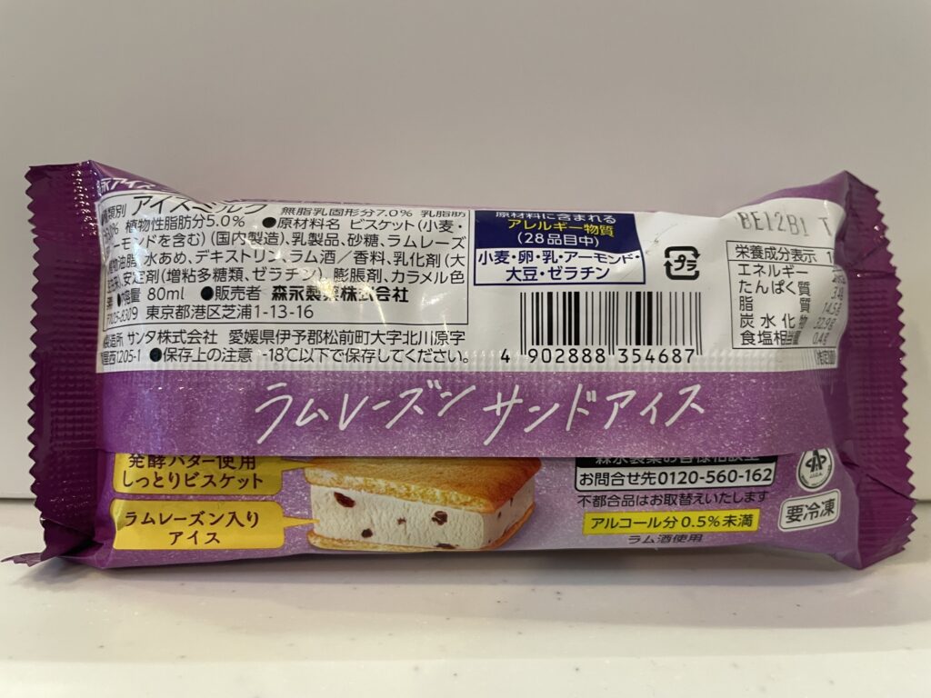 最後は森永製菓が販売し、愛媛県のサンタ株式会社が製造を担当した「ラムレーズンサンドアイス」です。