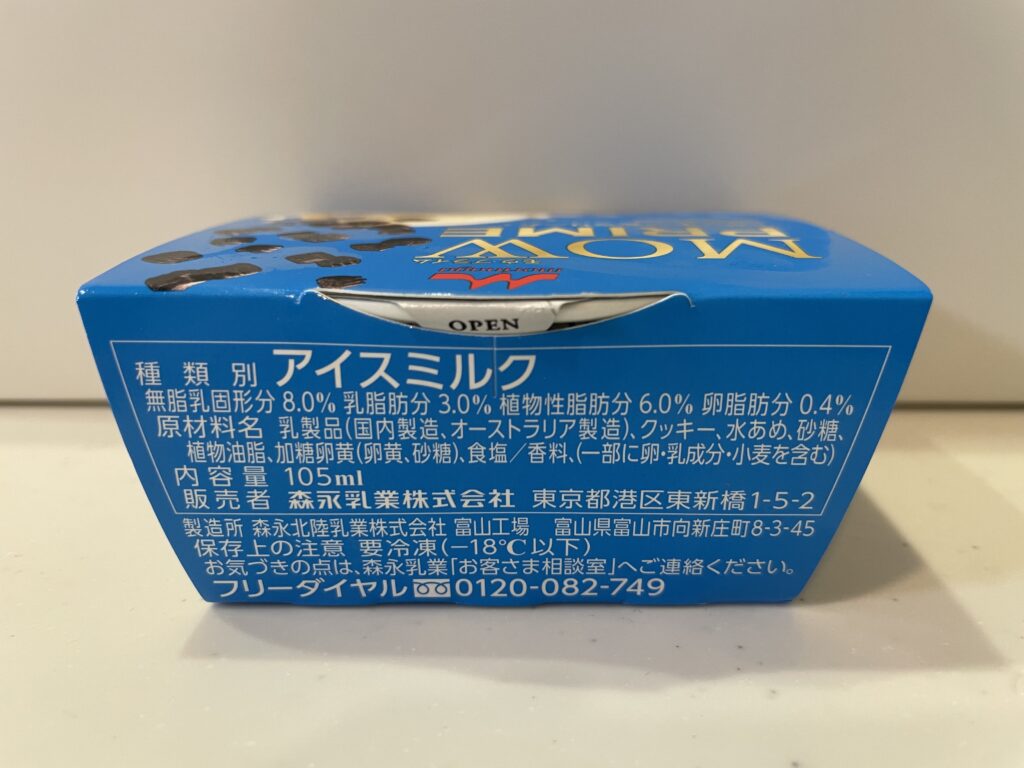 二つ目は森永乳業から発売されている「MOW PRIME(モウ プライム)クッキー&クリーム 」です。生クリームを使用したコク深いバニラアイスに、ココアクッキーがトッピングされています。