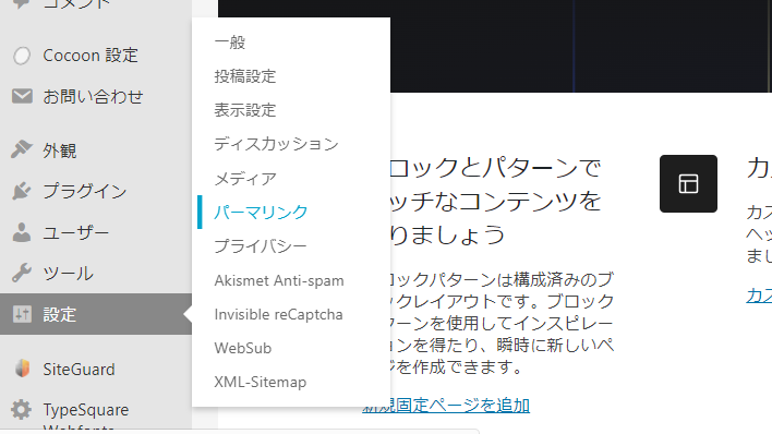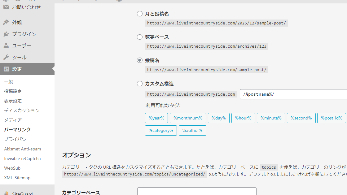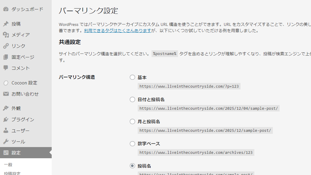 「投稿名」を選択すると、記事タイトルがパーマリンクになります。これによって、パーマリンクが 自動的に「https://www.xxxxx.com/記事タイトル/」と設定されるようになります。
