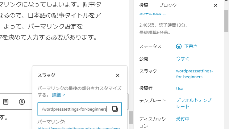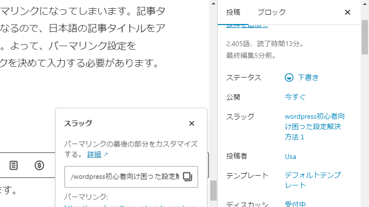 しかし、このままでは設定した記事タイトルがそのままパーマリンクになってしまいます。記事タイトルが日本語だと、URLに日本語が含まれてしまうことになります。日本語でも問題はありませんが、日本語パーマリンクはコピペすると文字化けするというデメリットがあります。よってパーマリンク設定を「/%postname%/」にしても、ページごとに毎回投稿画面などでパーマリンクを英単語に書き換えることをおすすめします。