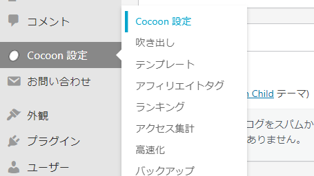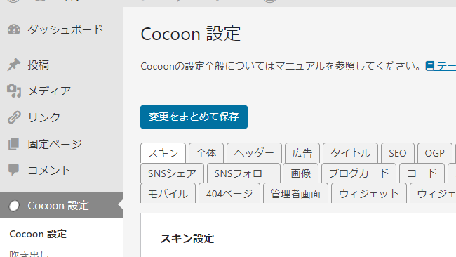 - 管理画面>Cocoon設定>「スキン」タブを選択します。
