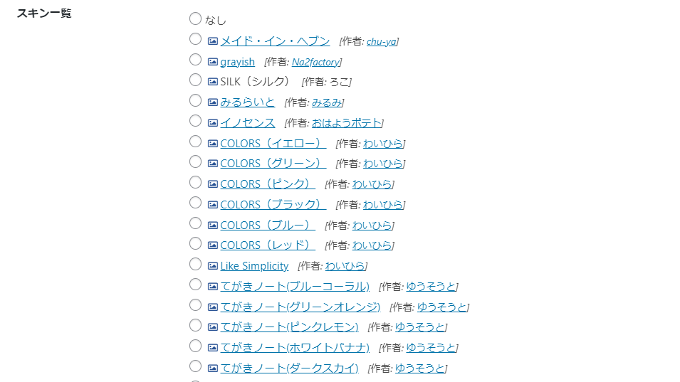- 「スキン」:テーマ内でデザインを変更する役割。変更範囲は主に色・フォント・装飾など外観部分。