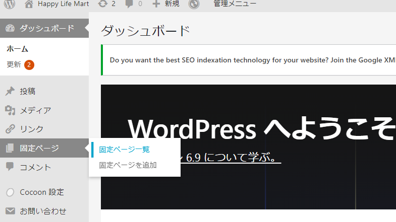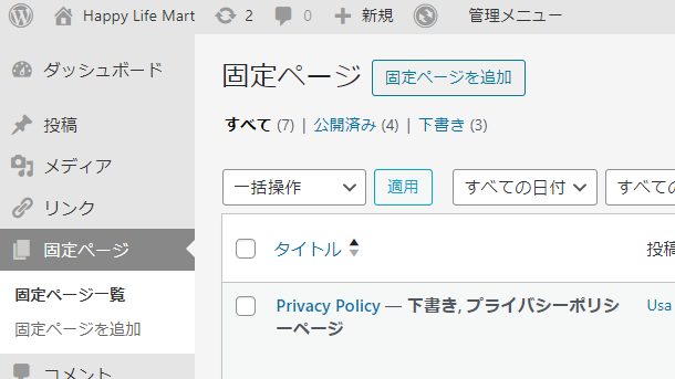 - 管理画面から固定ページ>固定ページ一覧(固定ページを追加でもOK)>固定ページを追加を押下します。