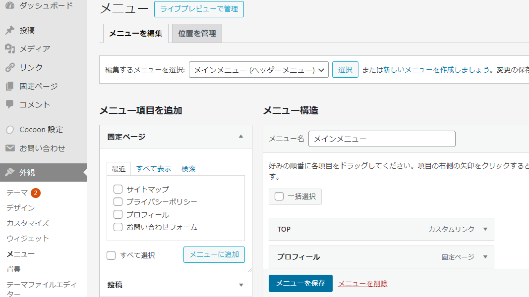 - 追加したメニューが「メニュー構造」に表示されました。追加した項目はドラッグ&ドロップで順番を変えることが出来ます。